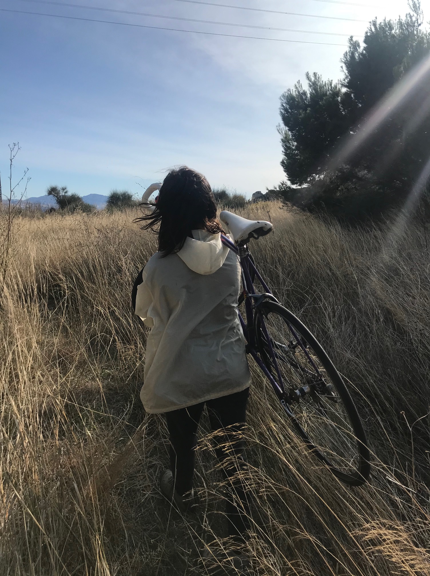 Je le porte sur mon épaule droit en sortant du train. Je descends les escaliers, je remonte les escaliers. J’ai encore 10 minutes avant d’arriver. Je monte sur mon vélo et je pars, je me laisse guider par son roulement. La première partie est la meilleure : vitesse, courbes, presque pas d’effort. Je garde mes yeux bien ouverts, j’ai des larmes au vent. Je m’enfuis parmi les voitures et les scooters qui me frôlent en passant le chemin de la Nerthe. Sauf quand je croise des cyclistes aguerris, je suis presque la seule ici. Plus on s’approche du vallon, plus mes cuisses brûlent.